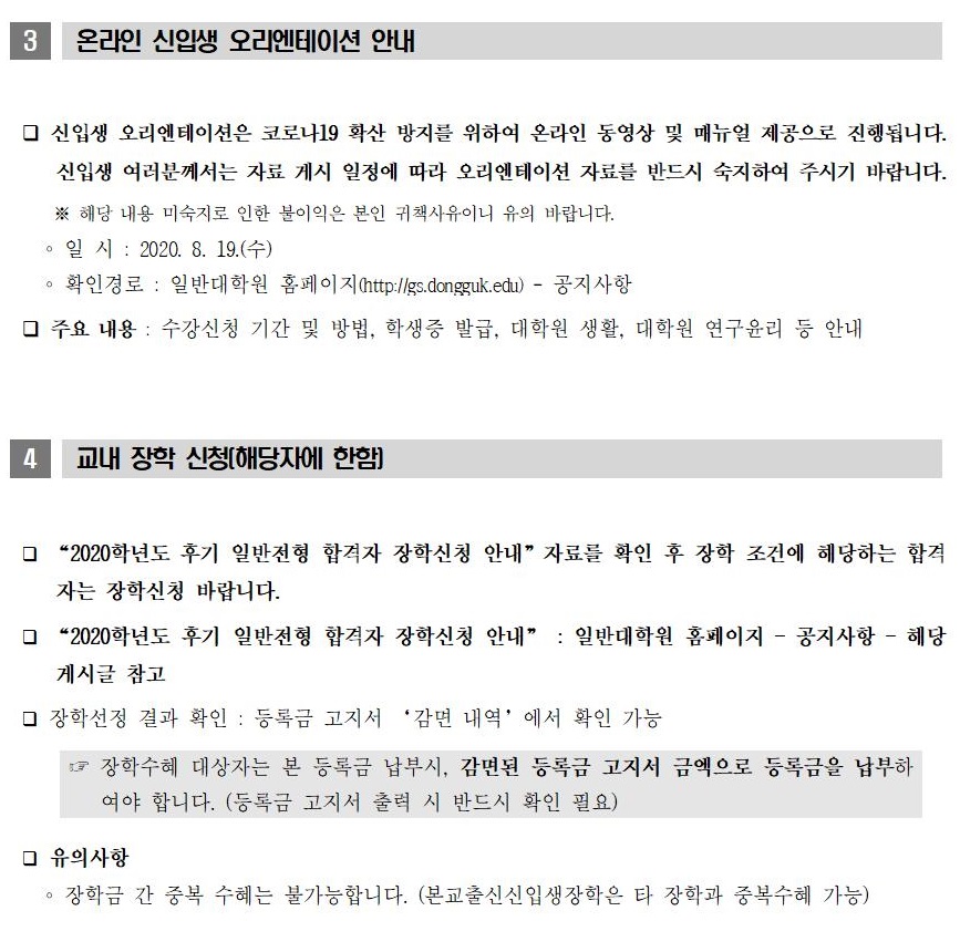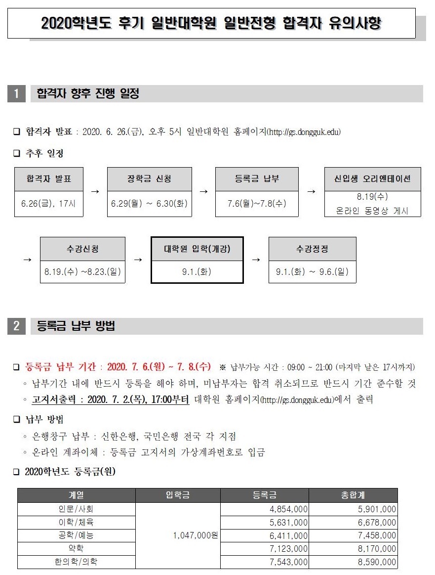 2020학년도 후기 일반대학원 일반전형 합격자 유의사항