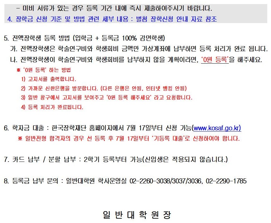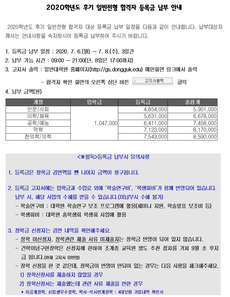 2020학년도 후기 일반전형 합격자 등록금 납부 안내