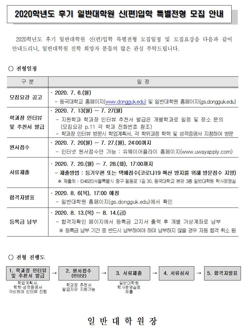 2020학년도 후기 일반대학원 신(편)입학 특별전형 모집 안내