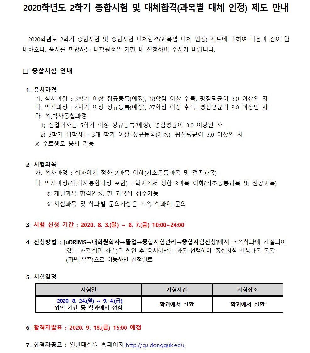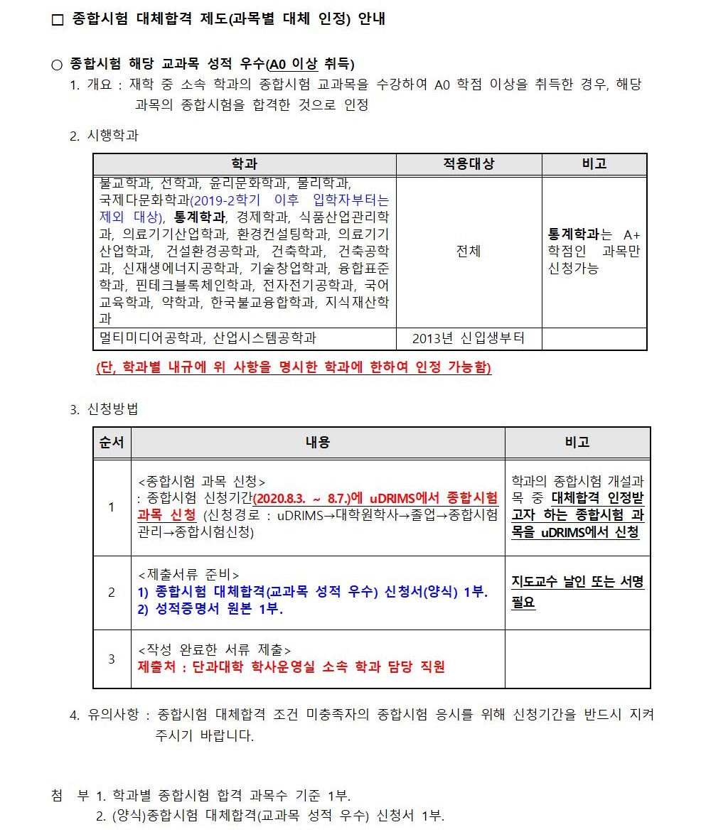첨부파일 종합시험 대체합격(교과목 성적 우수) 신청서(양식).hwp 학과별 종합시험 합격과목수 기준.xlsx (붙임1)2020-1학기 종합시험 및 종합시험 대체합격(과목별대체인정) 제도 안내문.hwp