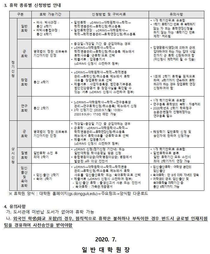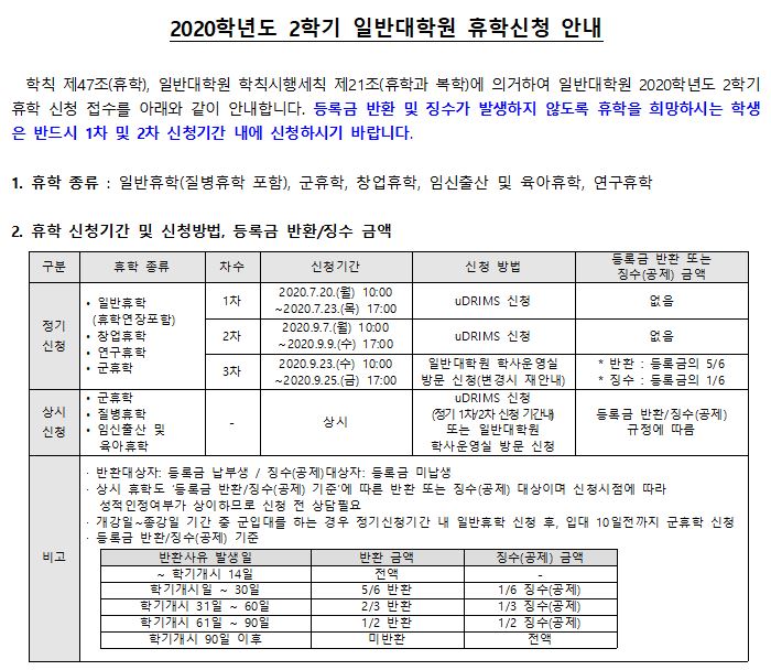 2020학년도 2학기 일반대학원 휴학신청 안내