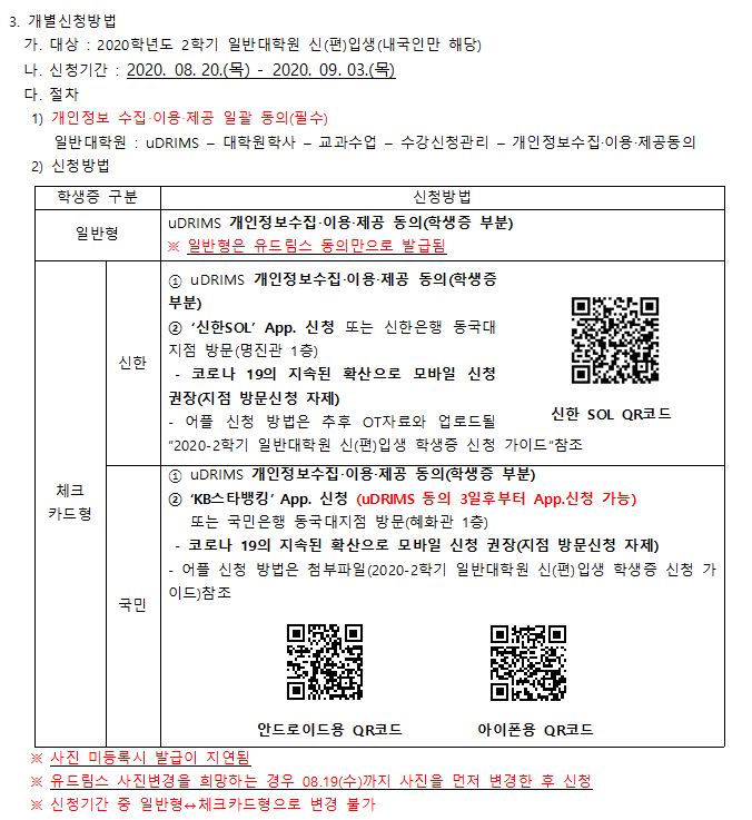 2020학년도 2학기 대학원 신(편)입생 학생증 발급 안내
