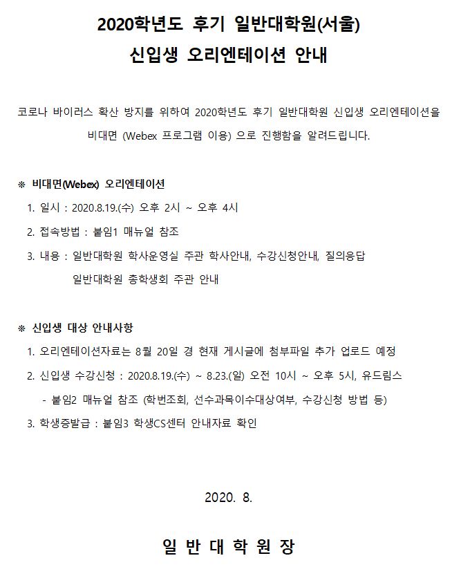 첨부파일 2020-후기 일반대학원 오리엔테이션 안내 자료.zip (붙임1) 2020-후기 신입생오리엔테이션 Webex 접속 매뉴얼(0818수정).pdf (붙임3) 2020-후기 신입생 학생증발급 매뉴얼.pdf (붙임2) 2020-후기 신입생수강신청 매뉴얼.pdf
