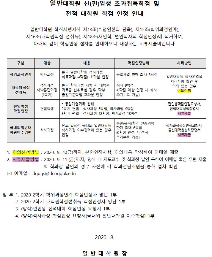 첨부파일 1.(공지용) 2020-2학기 학위과정연계 학점인정자 명단(박사).xlsx 4. (양식)석사과정 학점인정 요청서(타대학원).hwp 3. (양식)편입생 전적대학 학점인정 요청서.hwp 2. (공지용) 2020-2학기 대학원 교과목 선취득자 명단(석사,석박통합).xlsx