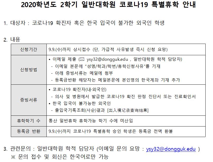 2020학년도 2학기 일반대학원 코로나19 특별휴학 안내