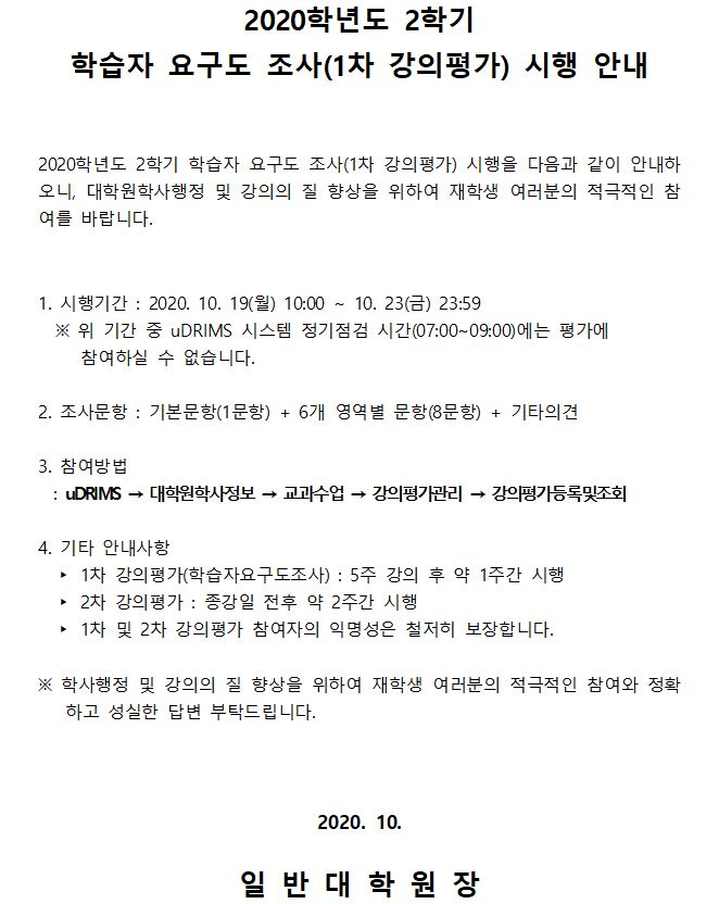 2020학년도 2학기 학습자요구도조사(1차강의평가) 시행안내