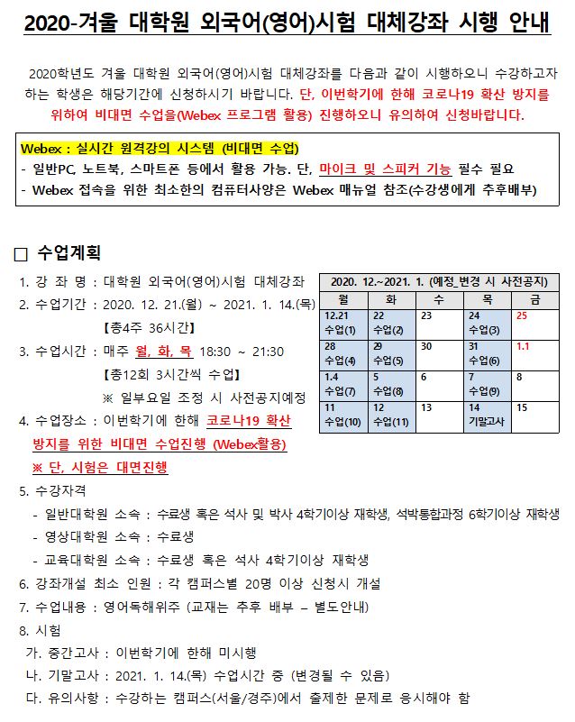 2020-겨울 대학원 외국어(영어)시험 대체강좌 시행 안내