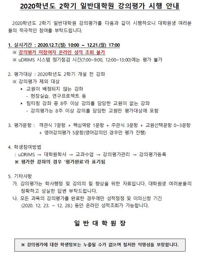 2020학년도 2학기 일반대학원 강의평가 시행 안내