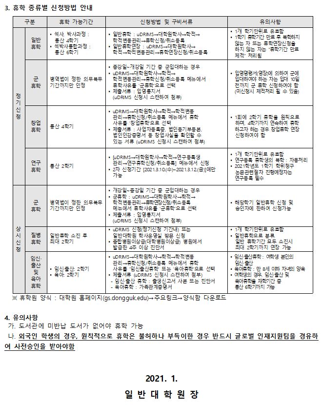 2021학년도 1학기 일반대학원 휴학신청 안내