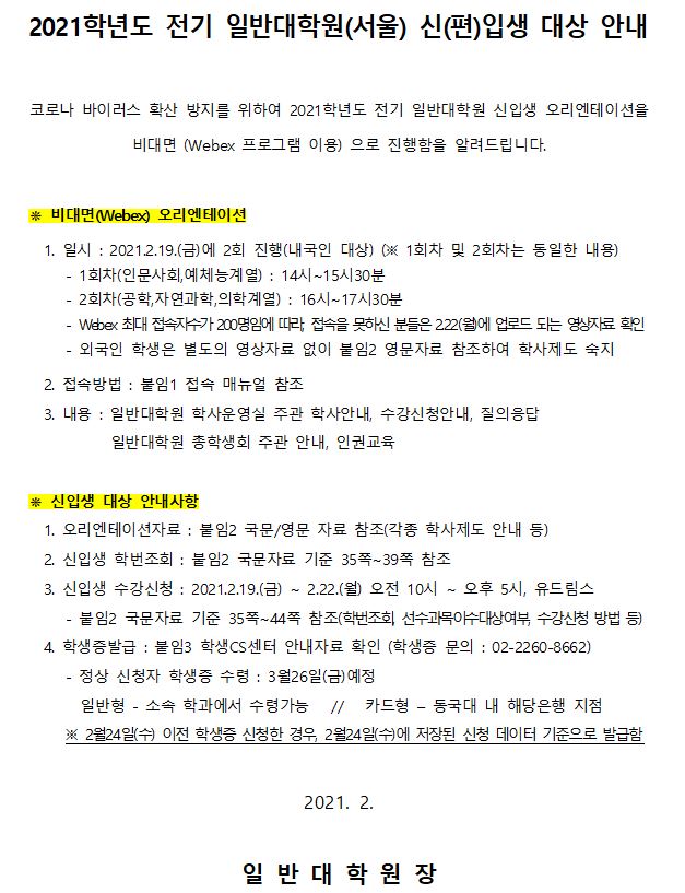 첨부파일 3. 2021-1학기 대학원 신(편)입생 학생증 발급 안내.pdf 2-2. 2021학년도 전기 일반대학원 오리엔테이션 자료 (영문)_공지용(20210222).pdf 2-1. 2021학년도 전기 일반대학원 오리엔테이션 자료 (국문)_공지용(20210222).pdf 1. 오리엔테이션 Webex 접속 매뉴얼.pdf