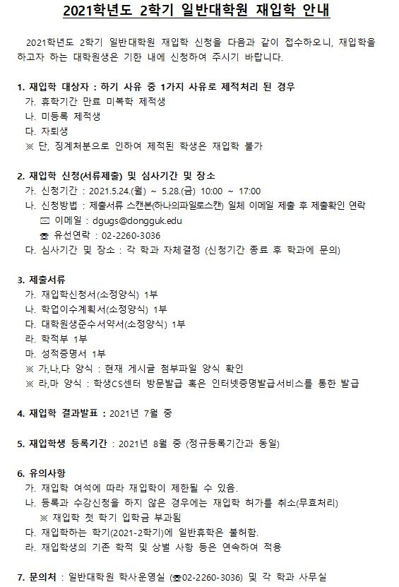 2021학년도 2학기 일반대학원 재입학 안내