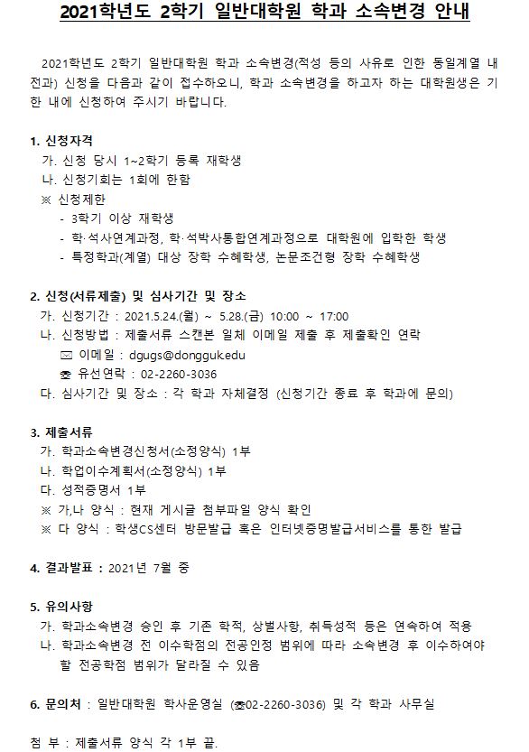 2021학년도 2학기 일반대학원 학과 소속변경 안내