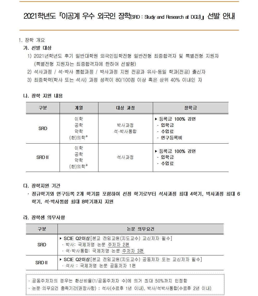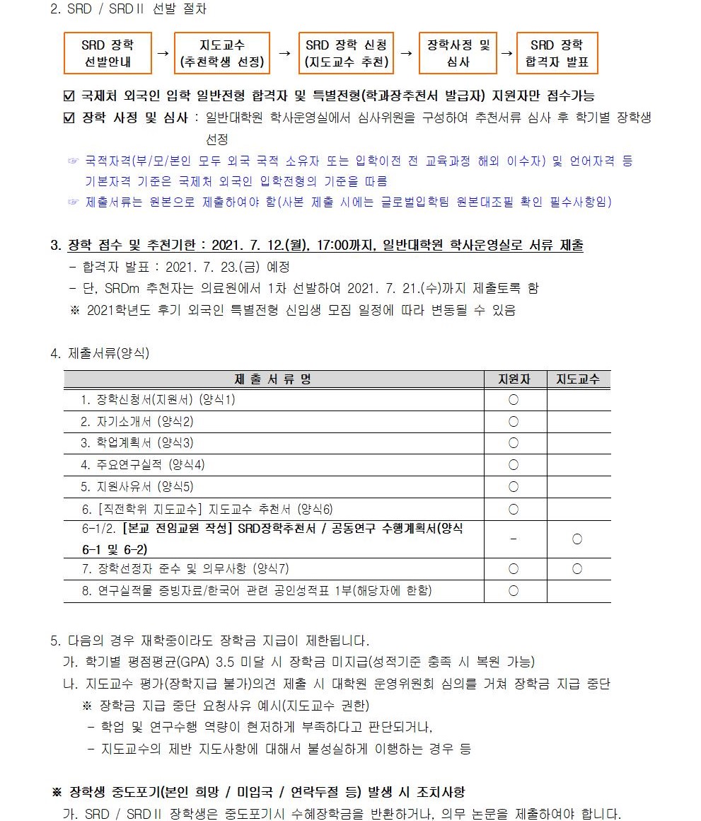 첨부파일 5. (교원양식)SRD추천서, 공동연구수행계획서(교원작성).hwp 4. (지원양식)2021 SRD2 Application Form.docx 3. (지원양식)2021 SRD1 Application Form.docx 2.2021학년도 후기 SRD 장학생 선발 안내(공지용)_영문_최종.docx 1.2021학년도 후기 SRD 장학생 선발 안내(공지용)_국문.hwp