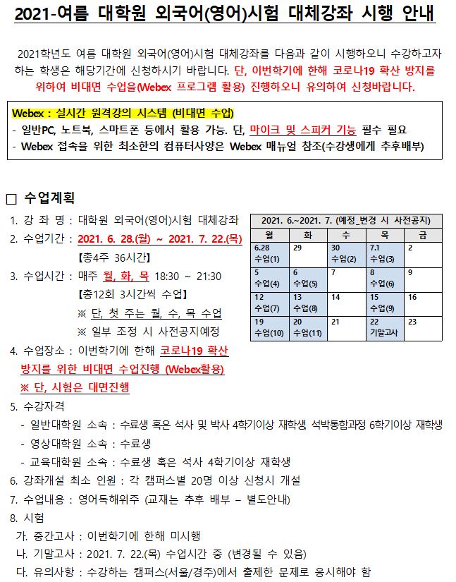 2021-여름 대학원 외국어(영어)시험 대체강좌 시행 안내 (수업일정변경)