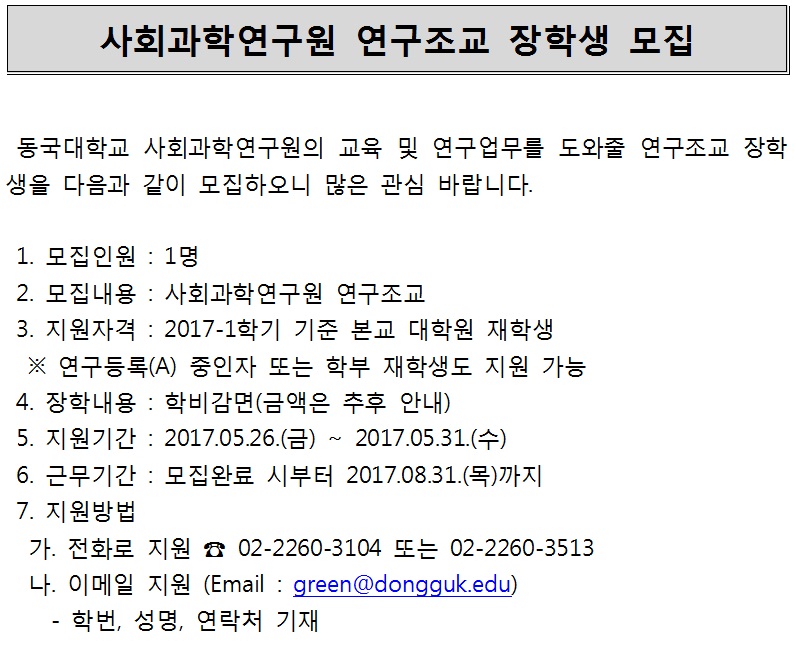 사회과학연구원 연구조교 장학생 모집(모집기한 연장)