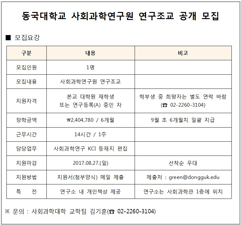 2017-2 사회과학연구원 연구조교 모집 안내