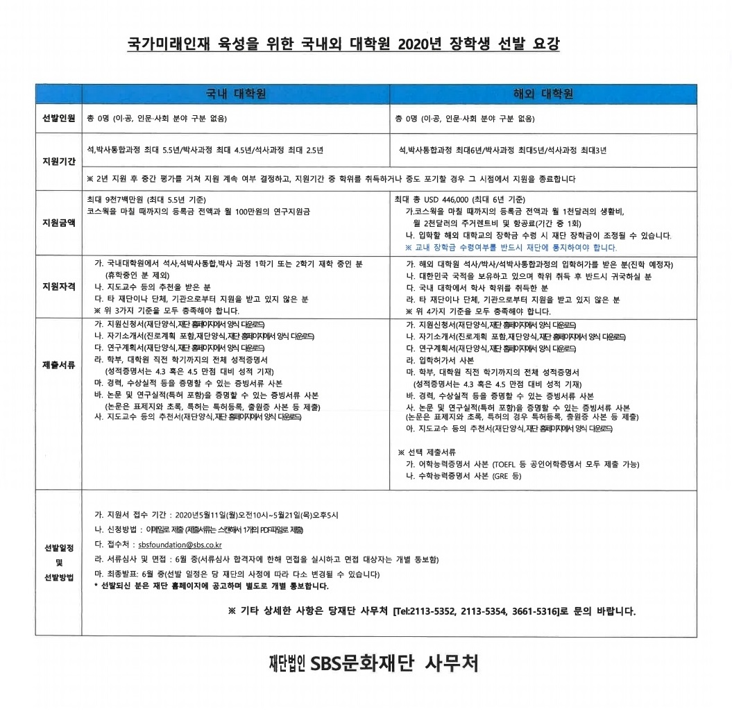 [SBS문화재단] 국가미래인재 육성을 위한 국내외 대학원 2020년 장학생 선발 요강