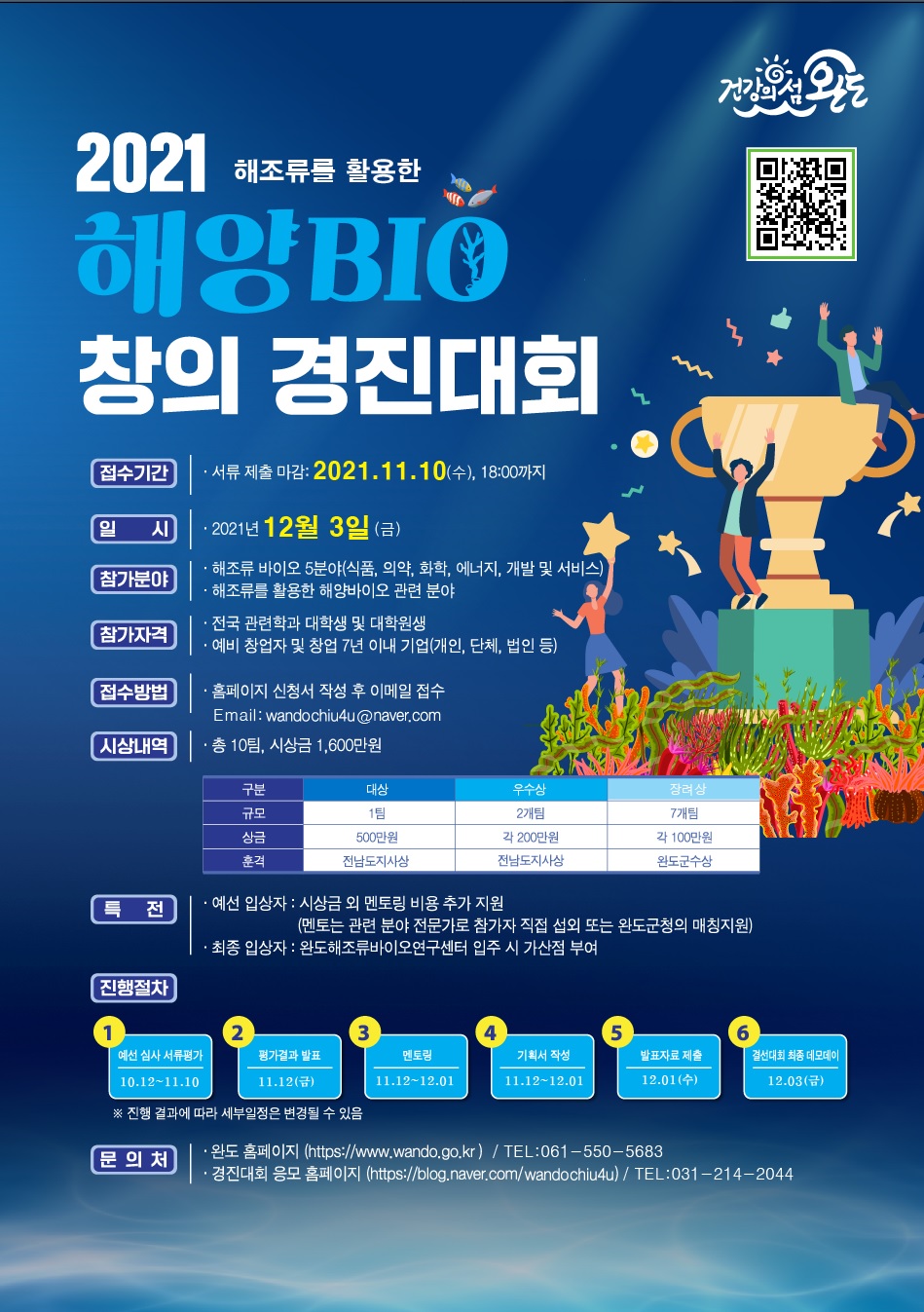 기타사항은 첨부된 공고문을 참조하여 주시기 바라며, 궁금하신 점은 완도군 해양치유담당관 해양치유블루존팀 제안업무 담당자(061-550-5683) 또는 경진대회 시행사 월드브릿지리더스 담당자(031-214-2044)로 연락주시기 바랍니다.